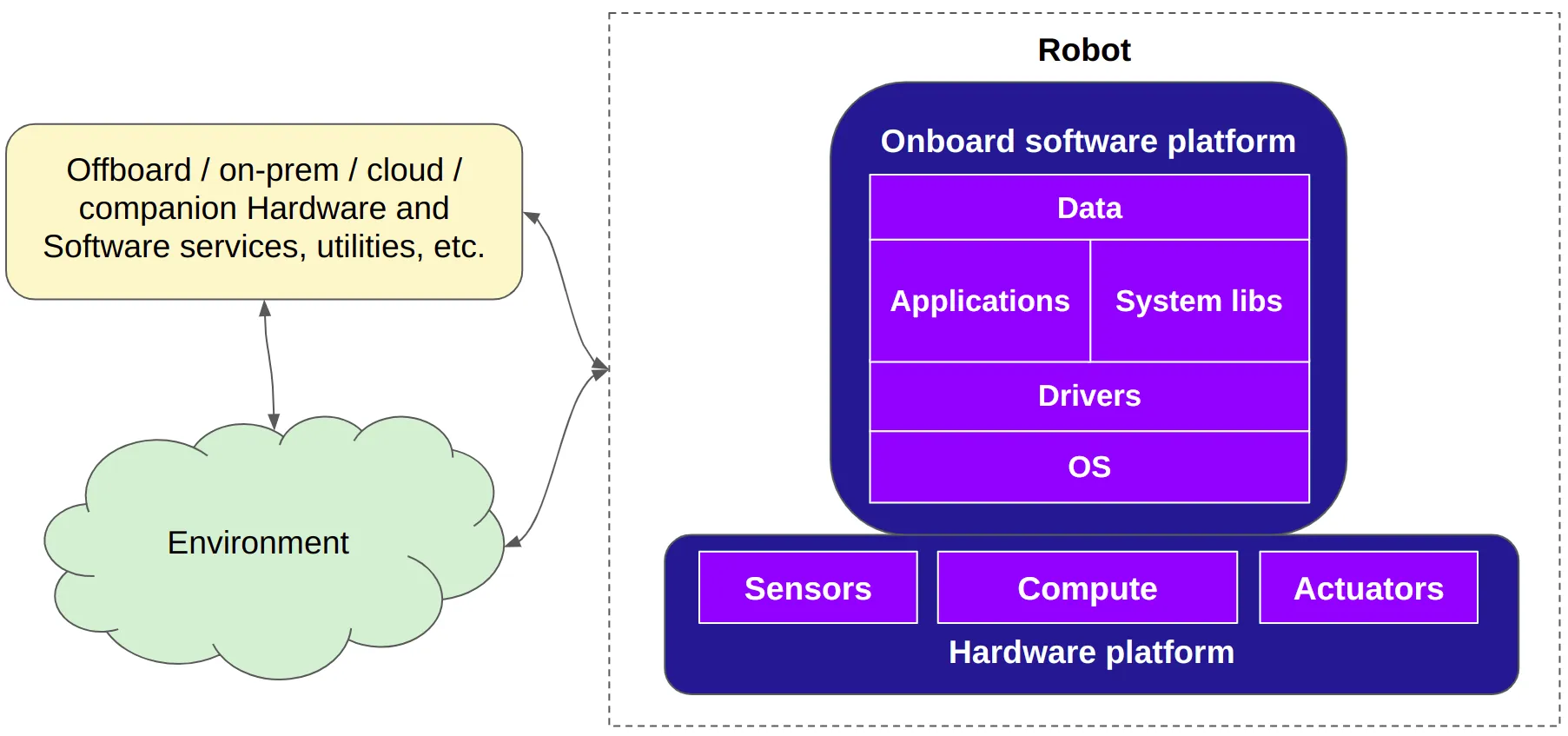 For the purpose of this analysis, it is convenient to start with some definitions that will help us later on. Using the supporting diagram below, a robot is a system composed of a hardware and an onboard software platform.